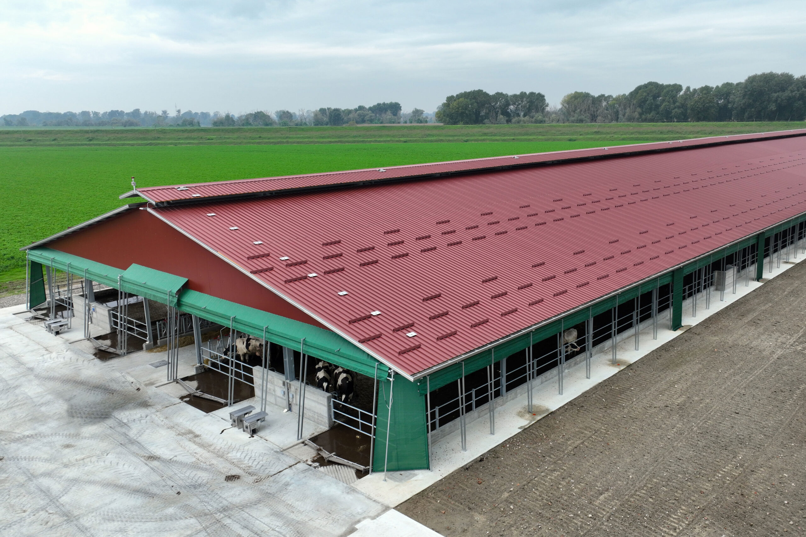 Per assicurare condizioni ottimali in ogni stagione, la stalla è dotata di chiusure motorizzate filtranti e ombreggianti, integrate con un sistema di ventilazione e raffrescamento suddiviso tra le zone di alimentazione e riposo. Questo approccio crea un microclima ideale, migliorando il benessere degli animali e la produttività complessiva.