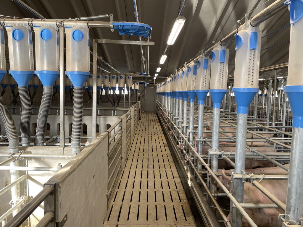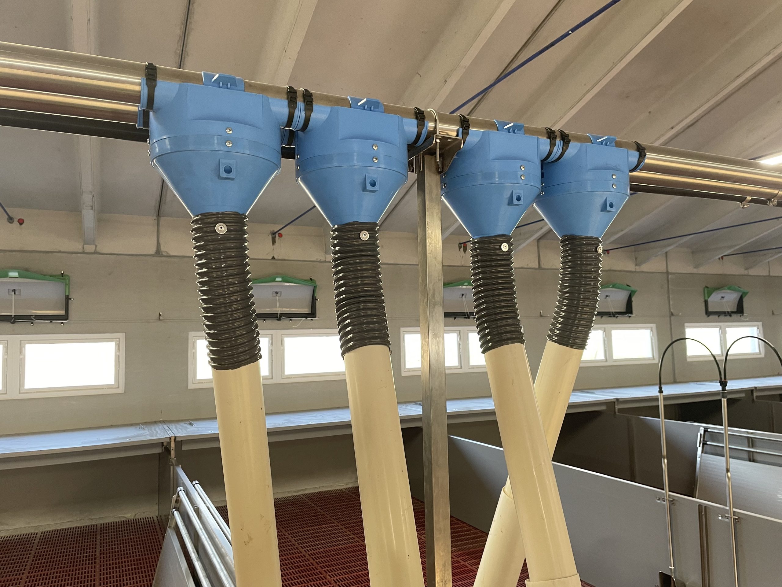 - un sistema di distribuzione a catena con valvole automatiche di scarico e sensori di svuotamento delle mangiatoie.